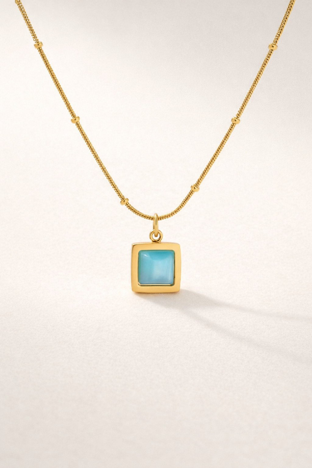 This modern, gold-tone piece features a sleek square pendant set with a vibrant azure stone, offering the perfect balance of clean geometry and bold color. The beaded snake chain adds a touch of texture and elegance, allowing the pendant to stand out with its smooth, luminous finish.
