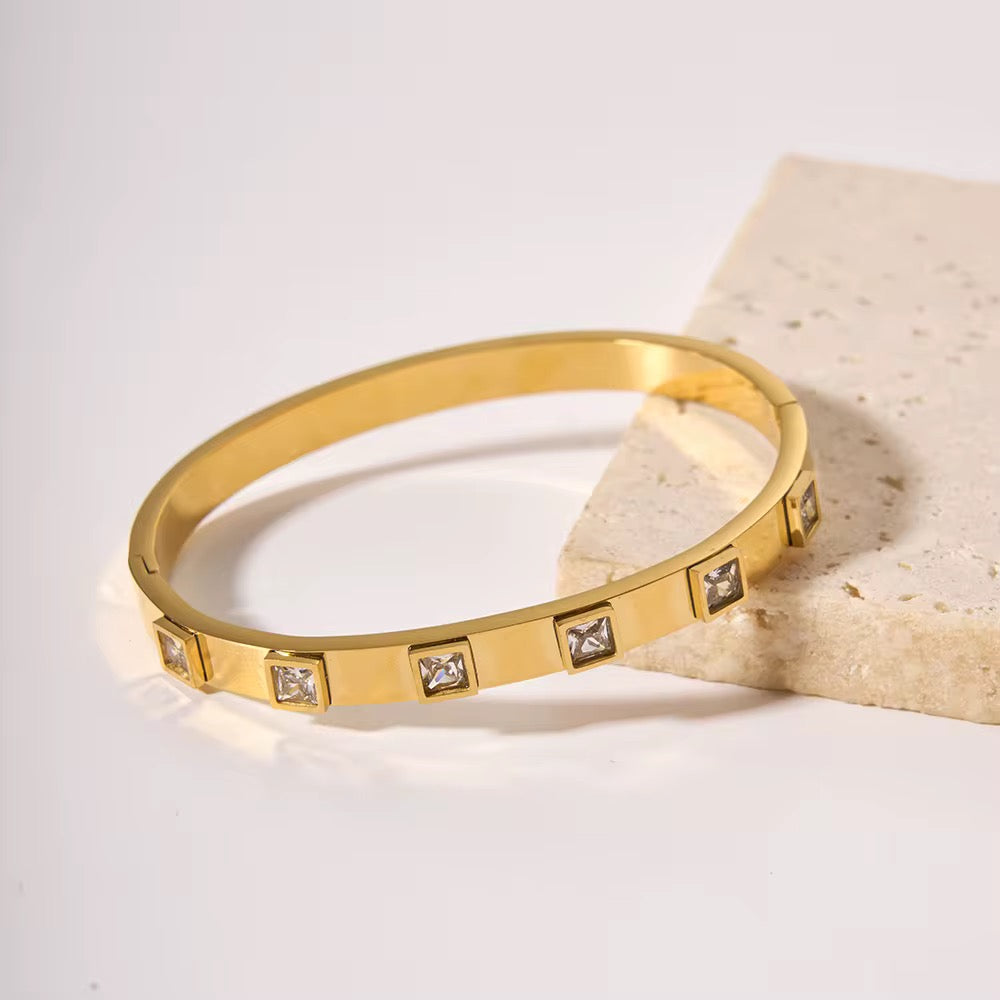 Sleek and sophisticated, this gold bangle features a row of perfectly spaced square-cut crystals that add a refined touch of sparkle. The smooth, polished finish enhances its modern silhouette, making it a standout piece that still feels minimal and elegant. Perfect for stacking or wearing solo, this timeless design pairs effortlessly with both everyday looks and dressier ensembles.