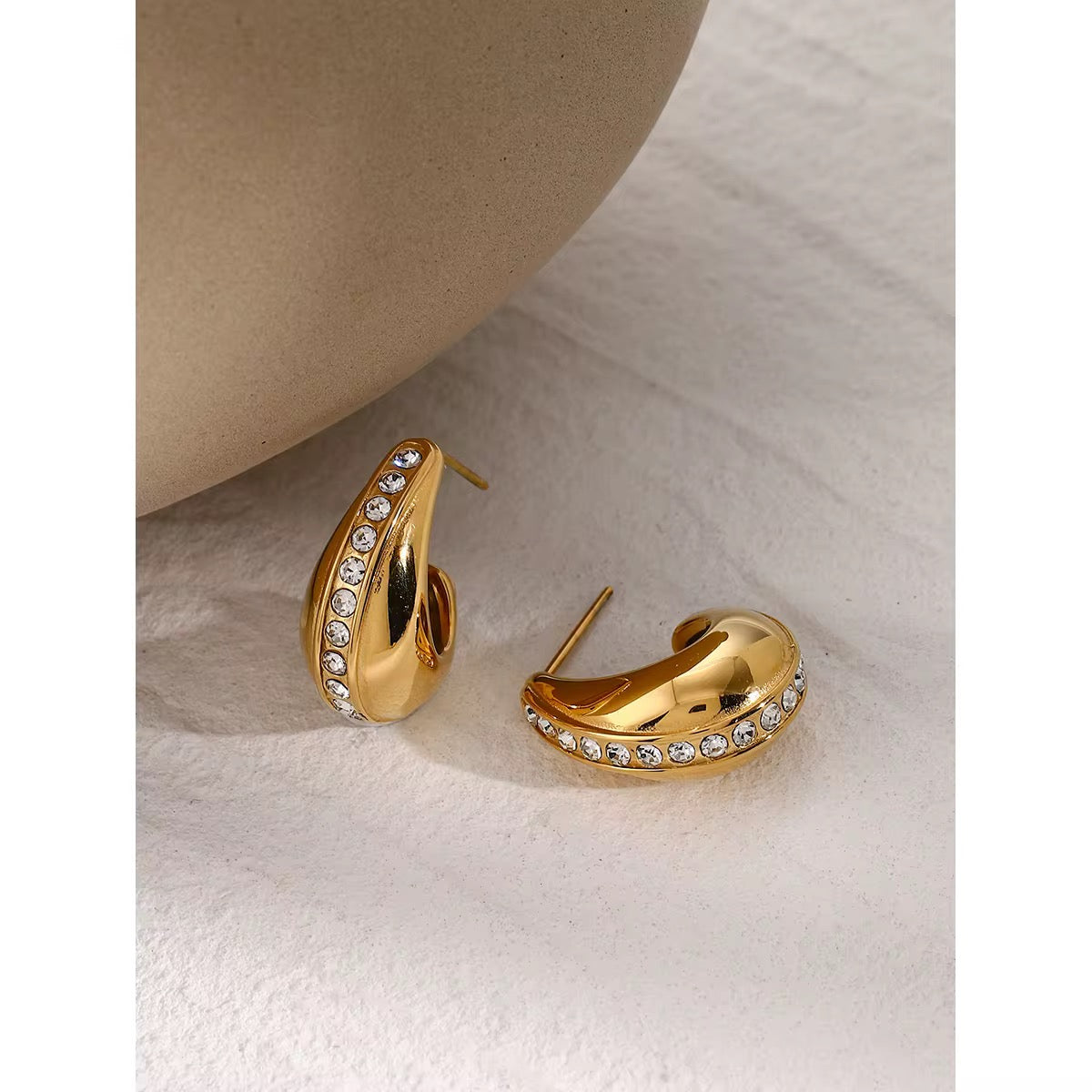 The Halo Teardrop Crystal Hoops are where sculptural elegance meets luminous sparkle. Crafted in a smooth, fluid shape, each hoop is lined with a row of radiant crystals that add just the right amount of brilliance without overwhelming the design. The combination of soft curves and refined shimmer makes these earrings both modern and timeless—perfect for elevating any look.