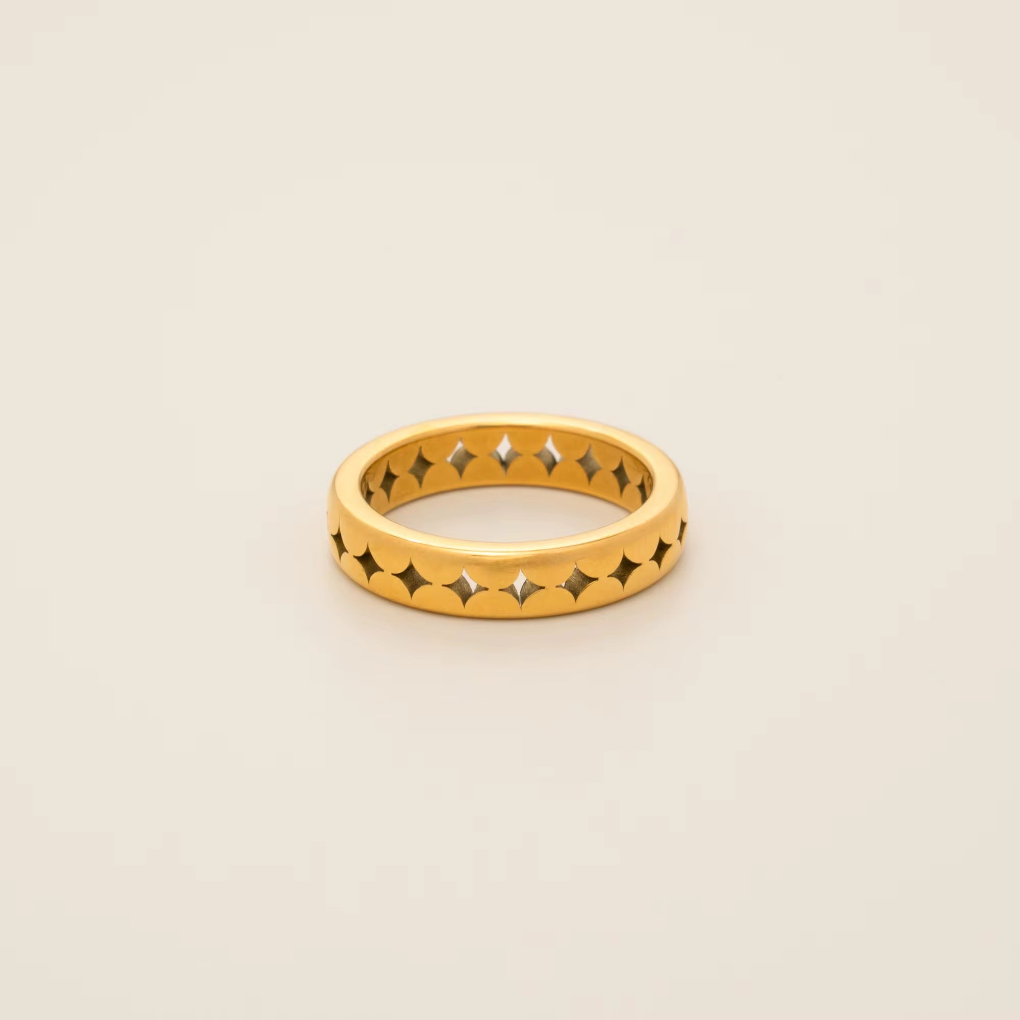 Radiate subtle elegance with the Starlight Cutout Band, a beautifully crafted piece designed to shine from every angle. The band features delicate star-shaped cutouts that create a soft play of light, giving it a dreamy, celestial charm. Its smooth, rounded finish adds a touch of sophistication, making it the perfect everyday statement.
